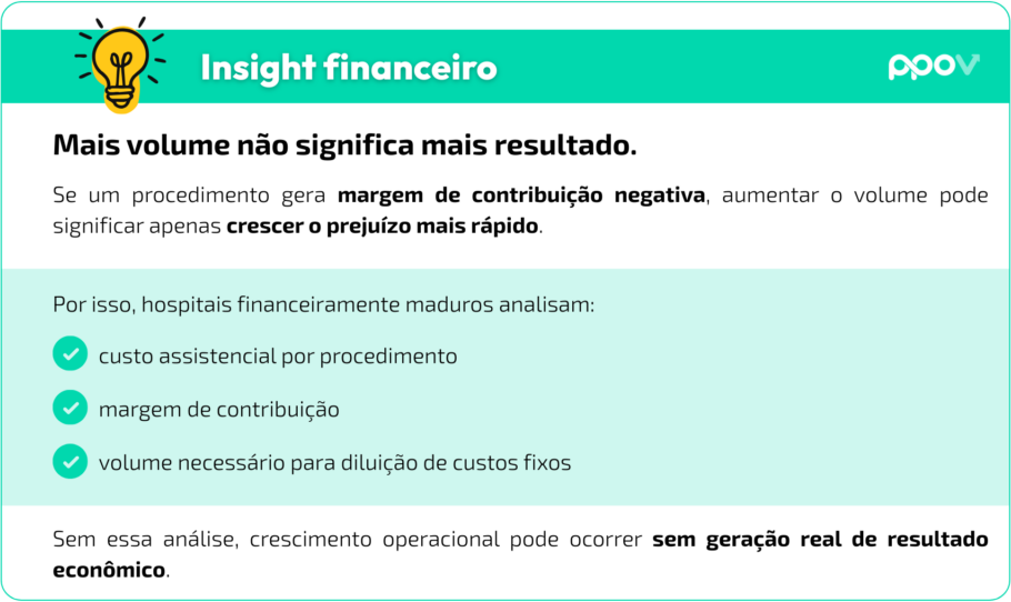 Sem clareza sobre margem de contribuição, hospitais tendem a aumentar o volume como estratégia para compensar margens pressionadas. No entanto, quando um procedimento apresenta resultado negativo, esse crescimento acaba ampliando o prejuízo.